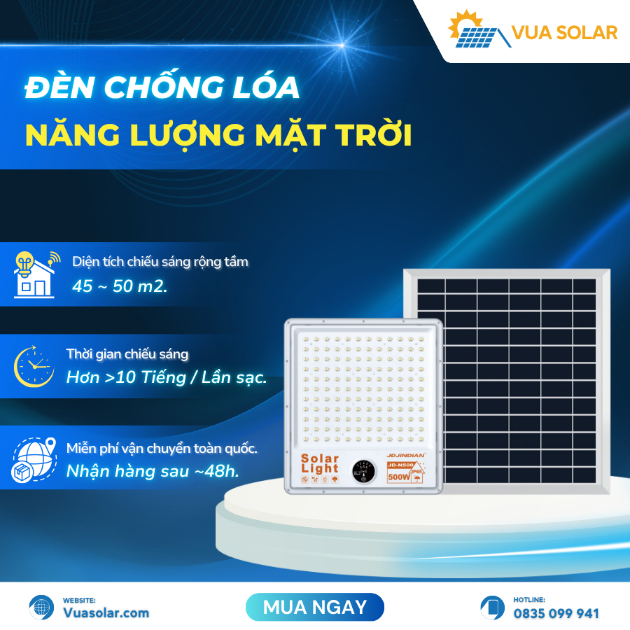 Bóng tối là nơi kẻ gian ẩn nấp, đặc biệt tại các góc khuất sân vườn hay khu vực không có điện. Đừng đánh đổi sự an toàn của tổ ấm! Đèn năng lượng mặt trời cảm biến chuyển động 500W JD-N500 từ Vua Solar chính là giải pháp tối ưu. Cung cấp ánh sáng cực mạnh, tiết kiệm điện và tích hợp công nghệ cảm biến hồng ngoại (PIR) thông minh. Chiếc đèn năng lượng cảm biến này không chỉ chiếu sáng mà còn là vệ sĩ tin cậy. Giúp bảo vệ ngôi nhà bạn khỏi mọi nguy cơ 24/7, ngay cả khi mất điện.
