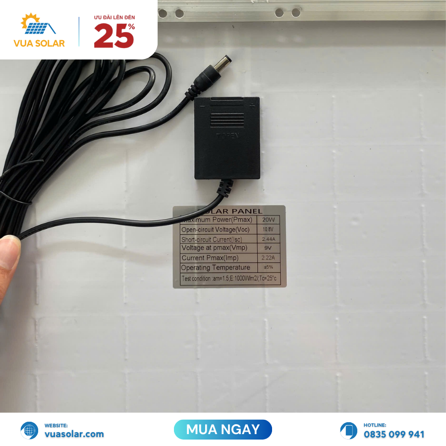 Tấm pin mono đi kèm với quạt V218 có công suất tối đa 20W, cung cấp đủ năng lượng để quạt hoạt động mạnh mẽ. Các thông số kỹ thuật chi tiết của tấm pin bao gồm điện áp hở mạch (Voc) là 10.8V, dòng điện ngắn mạch (Isc) là 2.44A, điện áp tại công suất tối đa (Vmp) là 9V, và dòng điện tại công suất tối đa (Imp) là 2.22A. Với nhiệt độ hoạt động được kiểm soát ở 45°C và điều kiện thử nghiệm tiêu chuẩn là AM=1.5 E=1000W/m2 Tc=25°C, tấm pin này đảm bảo hiệu suất ổn định trong nhiều điều kiện thời tiết.